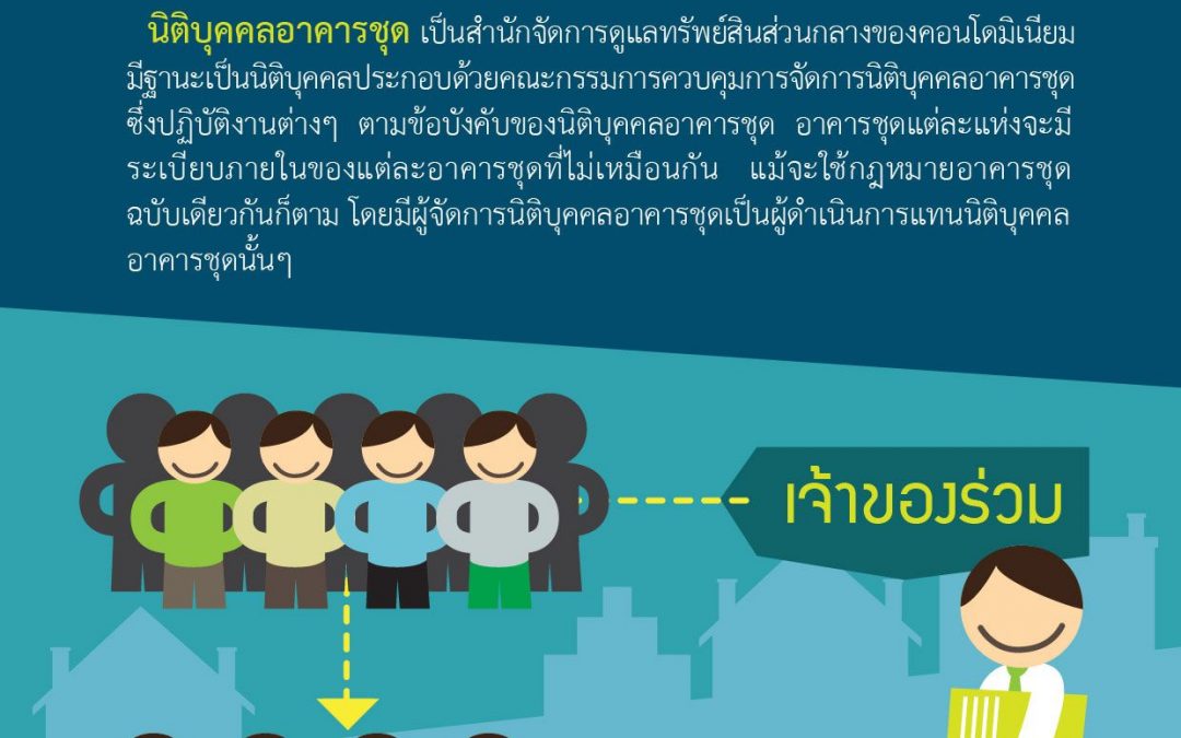 นิติบุคคลอาคารชุด เป็นสำนักจัดการดูแลทรัพย์สินส่วนกลางของคอนโดมิเนียม มีฐานะเป็นนิติบุคคล ประกอบด้วย คณะกรรมการควบคุม การจัดการนิติบุคคลอาคารชุด ทำหน้าที่ เป็นผู้บริหารจัดการดูแลทรัพย์ส่วนกลางในนามของนิติบุคคลอาคารชุด การปฏิบัติงานต่างๆจะเป็นไปตามข้อบังคับของนิติบุคคลอาคารชุด ซึ่งอาคารชุดแต่ละแห่งจะมีระเบียบภายในของแต่ละอาคารชุดที่ไม่เหมือนกัน แม้กฎหมายอาคารชุดจะใช้ฉบับเดียวกันก็ตาม ในแต่ละคอนโดจะมีผู้จัดการนิติบุคคลอาคารชุดเป็นผู้ดำเนินการแทนนิติบุคคลอาคารชุดนั้นๆ ผู้จัดการนิติบุคคลอาคารชุดจะเป็นบุคคลธรรมดาหรือนิติบุคคลก็ได้